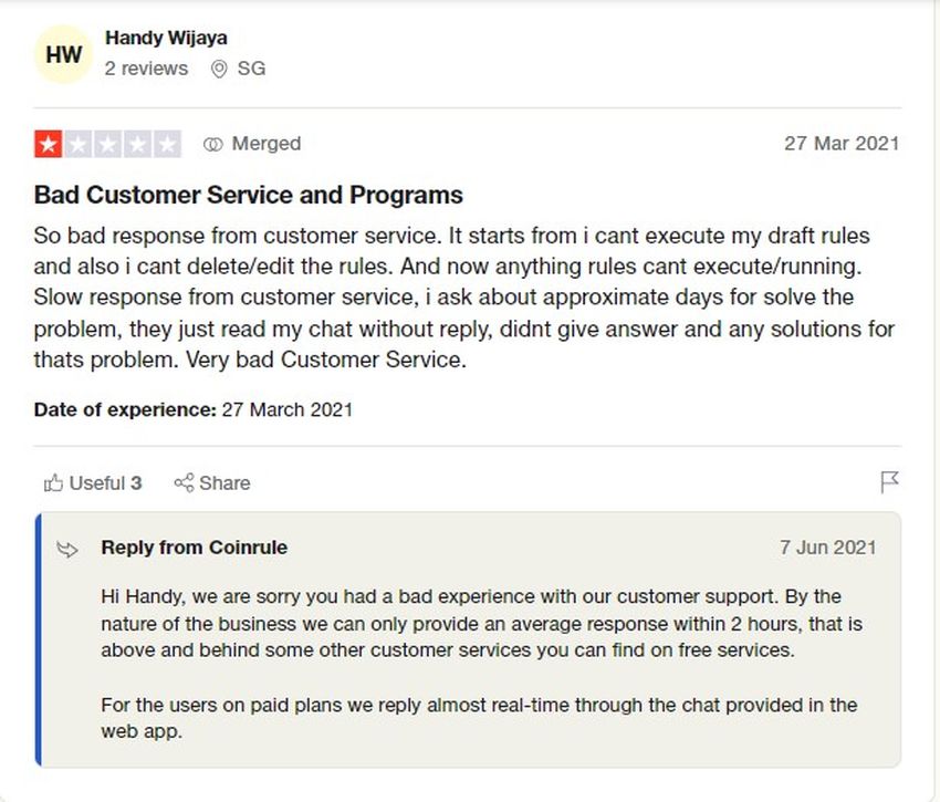 Vários usuários expressaram insatisfação com a experiência de atendimento ao cliente do Coinrule, citando questões como tempos de resposta lentos, falta de resposta a consultas específicas e percepção de falta de soluções para problemas técnicos.