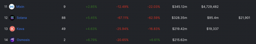 - Solana (SOL) está em 14º lugar na lista por valor de mercado, caindo uma posição abaixo de Shiba Inu.