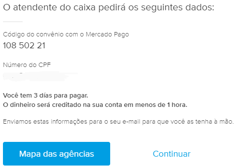 Você terá um prazo de até 3 dias para realizar o pagamento em uma lotérica. Uma vez efetuado este pagamento, o dinheiro será creditado em sua conta no Mercado Pago em até 1 hora.
