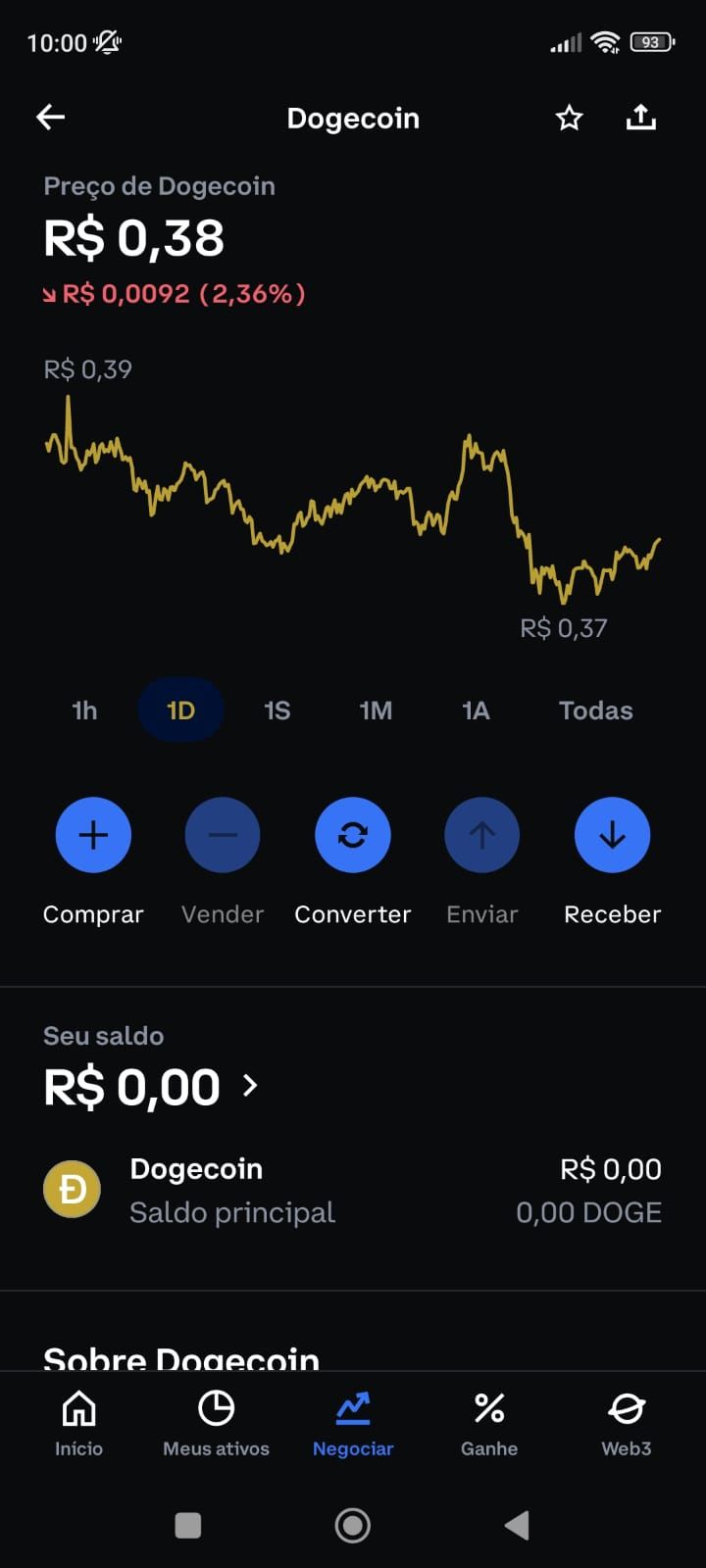 Agora que você já depositou via PIX, é hora de comprar Dogecoin (DOGE). Entre no aplicativo da Coinbase e clique em “negociar”.