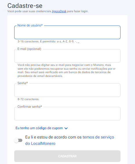 Visite o site LocalMonero e crie uma conta. É um processo simples; você nem precisa compartilhar seu e-mail se não quiser. Porém, a inscrição via e-mail contém alguns benefícios.