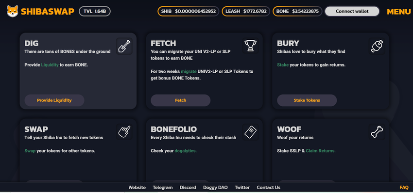 A plataforma ShibaSwap, lançada em julho de 2021, oferece uma infinidade de recursos. O recurso “Dig” permite que os usuários forneçam liquidez à DEX em troca de BONES. Já o staking em qualquer um desses pools pode render uma grande quantidade de juros ao longo do tempo, mas 66% dos retornos serão bloqueados por 6 meses. Essa regra evitará que os stakers do ShibaSwap vendam uma grande parte de seus tokens recém-adquiridos imediatamente e deve ajudar a manter seus preços altos.