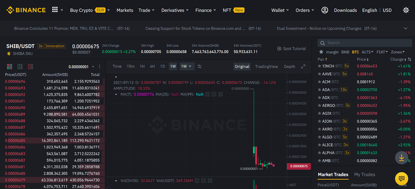 A moeda Shiba Inu também está disponível para trading na Huobi. Ela pode ser comprada com Tether (USDT). Além disso, a Huobi oferece depósitos rápidos com cartão de crédito diretamente na plataforma.