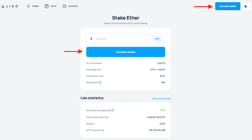 Acesse stake.lido.fi e conecte sua carteira ao aplicativo Lido. Para fazer isso, basta clicar no botão “ Conectar carteira ” abaixo do valor do Stake Ether ou usar a parte inferior no canto superior direito.