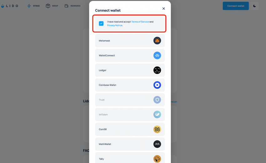 Observe que você pode selecionar qualquer uma das carteiras suportadas e precisará ter um saldo ETH nessa carteira. Depois de selecionar sua carteira na lista de carteiras suportadas, você terá que confirmar a conexão com o aplicativo Lido da sua carteira.