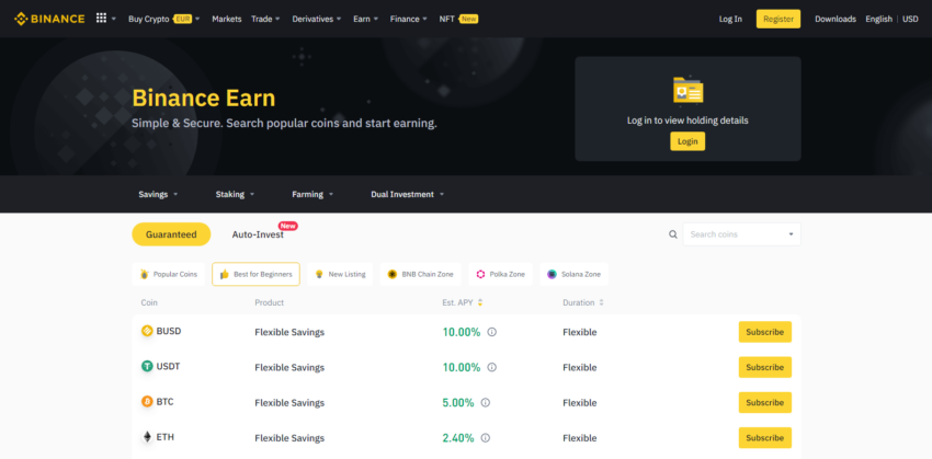 A Binance está entre as maiores exchanges de criptomoedas e, com o recurso Binance Earn, você pode ganhar dinheiro com Ethereum com seus depósitos. É uma exchange centralizada que oferece até 5,2% APY.