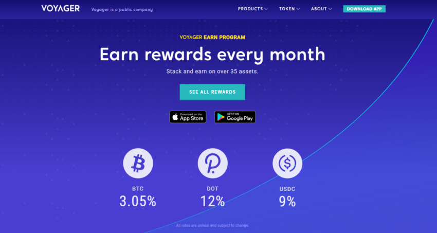 A Voyager é uma plataforma simples de criptoativos que fornece varejo que permite que você ganhe juros sobre seus ativos. Seu rendimento percentual anual é pago mensalmente.