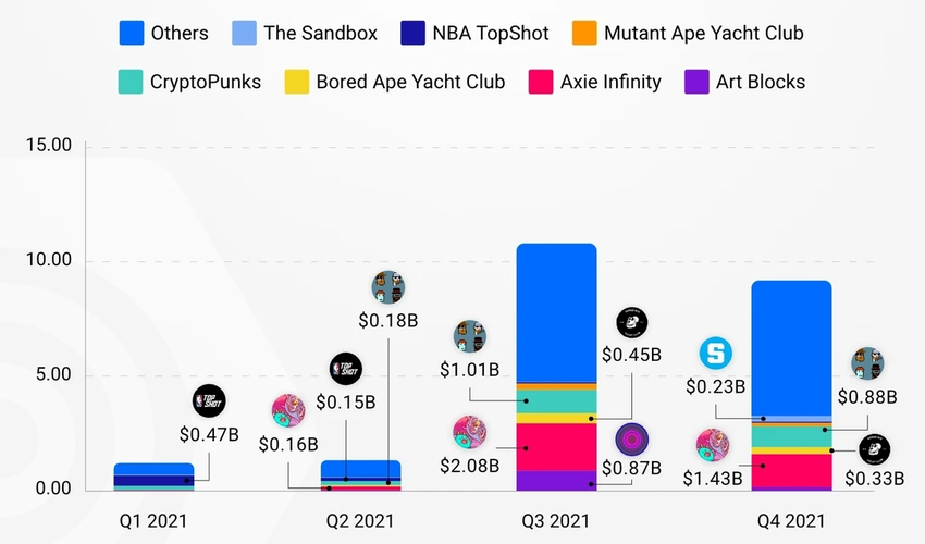 De acordo com o relatório da indústria da DappRadar, o nicho acumulou mais de US $ 23 bilhões em volume de negócios, tornando 2021 o melhor ano até agora. O NFT mais caro já vendido é a obra de arte de Beeple “Everydays: the First 5000 Days”, leiloada por US $ 69 milhões em março de 2021. Desde 2021, o OpenSea é o mercado NFT mais popular, contando com volumes de negociação NFT de mais de US $ 16 bilhões em criptomoedas.