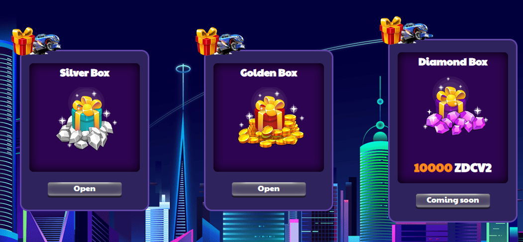 Para começar a jogar você precisa ter um carro. A primeira coisa que você precisa fazer é abrir uma caixa. Cada caixa contém um carro aleatório. Além disso, o preço mais baixo para abrir a caixa é de 3.500 ZDCV2.