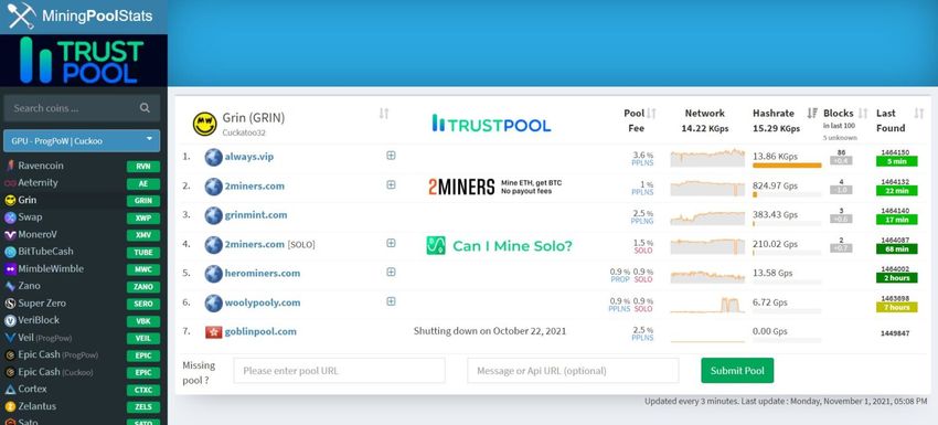 Escolha qualquer pool de mineração disponível. Você pode encontrar a maioria dos pools de mineração de Grin em miningpoolstats.stream/grin.