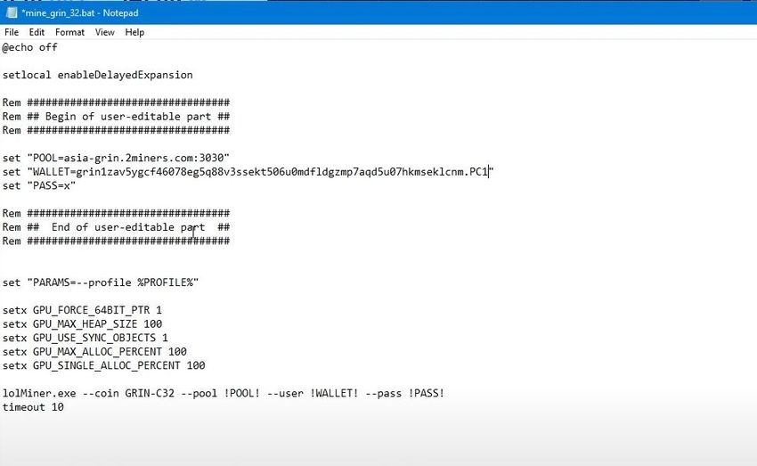 Vá para lolMiner> 1.28a> miner_grin_32.bat e clique duas vezes para executar o arquivo bat.