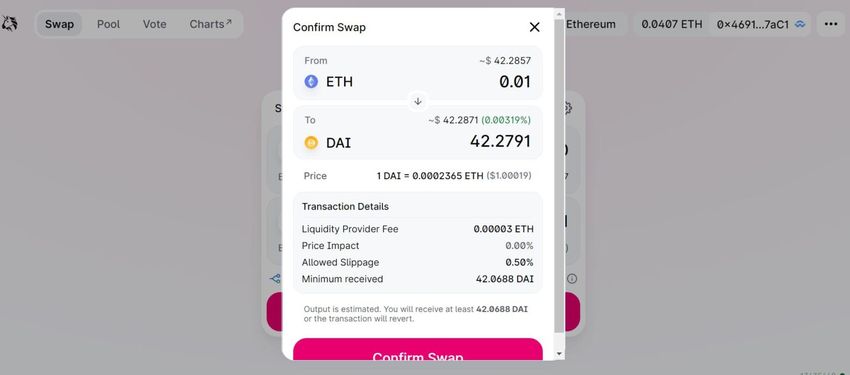 Vamos supor que você queira trocar ETH por DAI. Se você quiser trocar um valor específico de ETH, deverá inserir esse valor no campo ETH. Além disso, se você deseja uma quantidade específica de DAI, pode inserir esse valor no campo Valor de DAI.