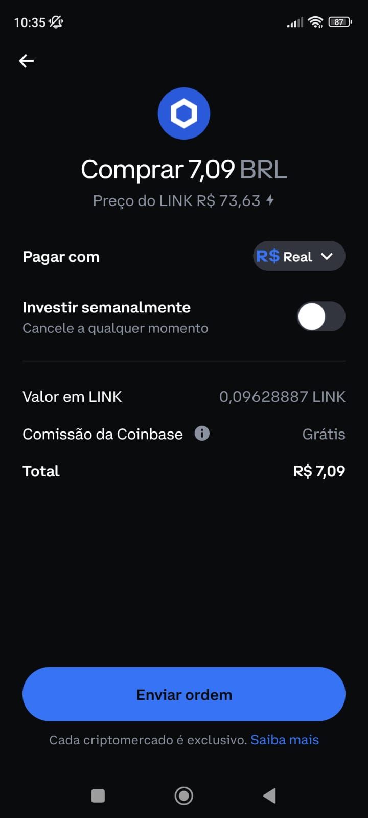 Pronto, você acabou de comprar Chainlink (LINK) usando PIX na Coinbase.