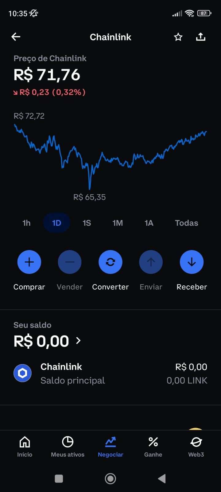 Agora que você já depositou via PIX, é hora de comprar Chainlink (LINK). Entre no aplicativo ou site da Coinbase e clique em “negociar”.