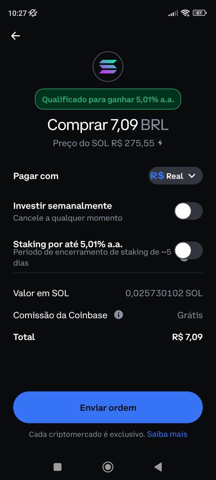 Pronto, você acabou de comprar Solana (SOL) usando PIX na Coinbase.