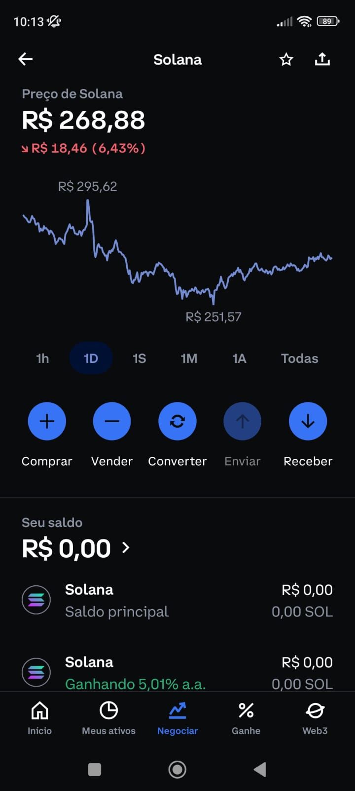 Agora que você já depositou via PIX, é hora de comprar Solana (SOL). Entre no aplicativo ou site da Coinbase e clique em “negociar”.