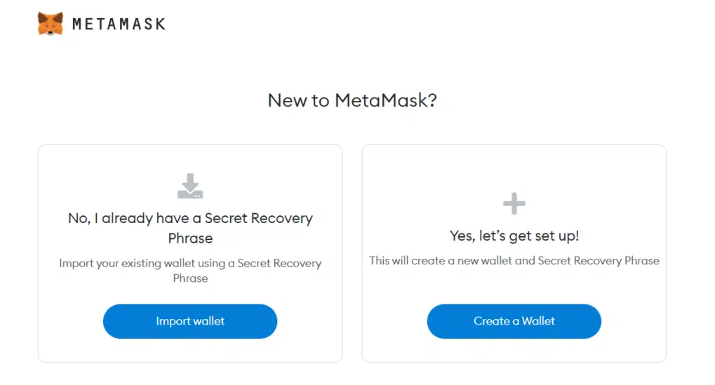3º passo – Ao iniciar o processo de configuração da sua carteira MetaMask, o plug-in vai perguntar se você já possui uma carteira da MetaMask existente ou se é a sua primeira vez utilizando a plataforma. Se você já possui uma carteira clique em “Importar carteira” e insira a sua frase de recuperação. Caso contrário, clique em “Criar uma carteira” para criar sua carteira de criptomoedas.