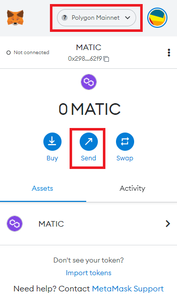 1º passo – Clique em “Enviar” na sua carteira MetaMask. Certifique-se de que você está utilizando a rede correta para enviar os fundos. Por exemplo, utilize a rede Polygon para realizar a transferência de fundos MATIC.