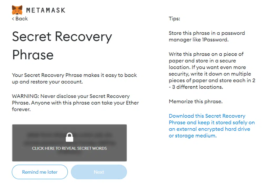6º passo – O aplicativo vai mostrar um pequeno vídeo sobre as frases de recuperação. Clique em “Avançar”. A página vai exibir a imagem abaixo. Clique em “clique aqui para revelar as palavras secretas”. Essa é a lista de 12 palavras aleatórias em uma sequência especificada que você deve utilizar se esquecer a sua senha. Ao anotá-las, é importante prestar atenção à grafia correta e a sequência adequada.