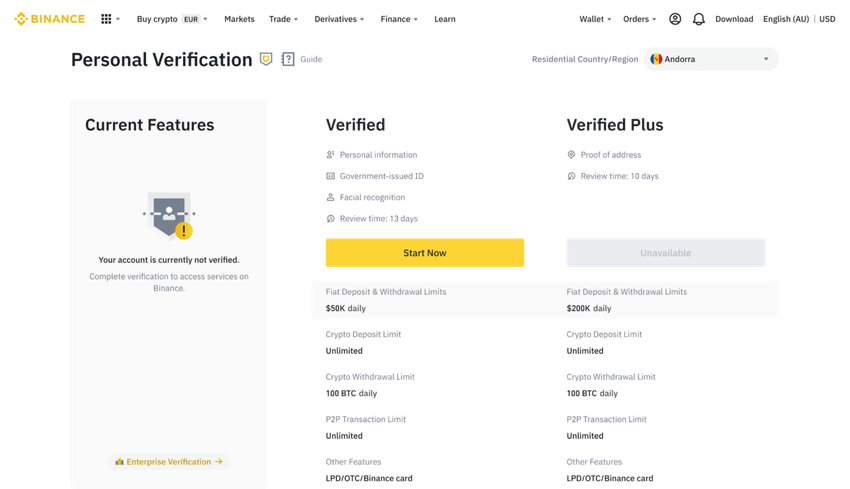 Você precisa seguir todas as etapas do processo de identificação. Você será questionado sobre seu país de residência e cada país terá um conjunto diferente de requisitos.