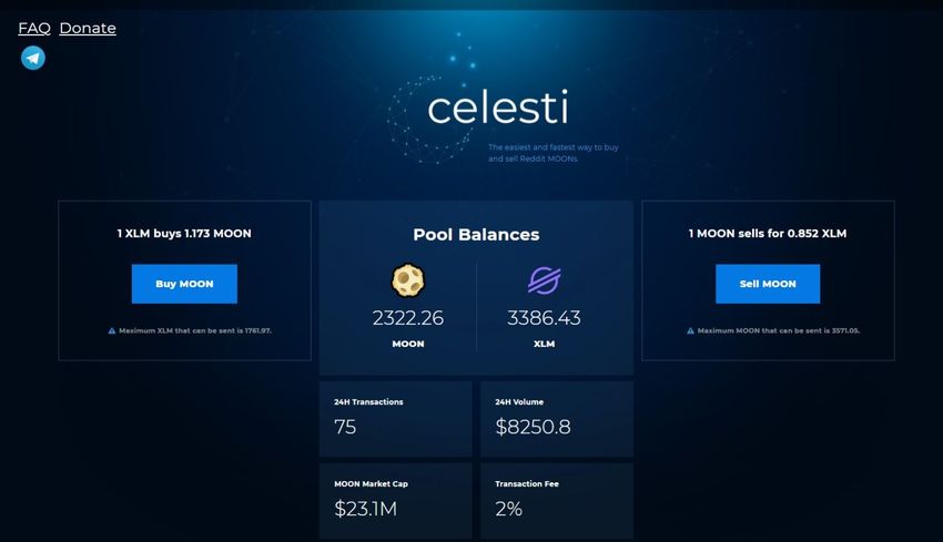 Acesse o Celesti.trade para começar. Observe que você precisará de ter Stellar (XLM) para fazer uma compra. Clique em “Comprar MOON” e insira o endereço da carteira do seu vault do Reddit. Isso garante que o MOON será enviado corretamente para você.