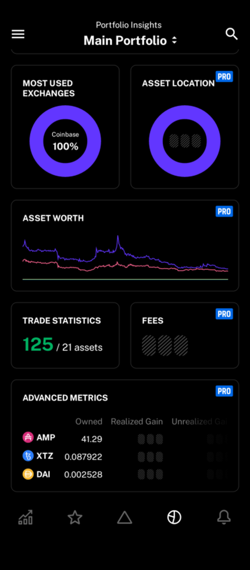 - Análise de portfólio: insights sobre distribuição de moedas, detalhamento de taxas, principais exchanges, entre outros;