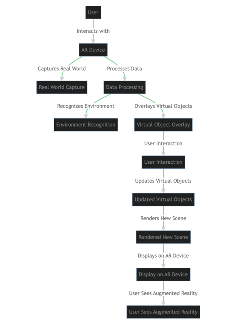 As câmeras processam informações e as compartilham com o cliente AR, onde ocorre o levantamento ou processamento pesado. Depois de concluídas, as sobreposições digitais são exibidas no meio em questão – smartphone, óculos AR ou diretamente no olho.