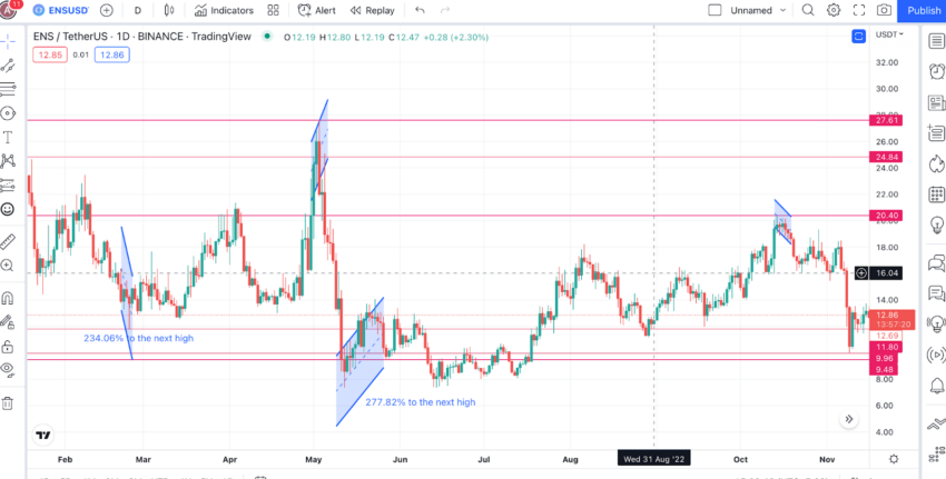 Outra observação interessante é a resposta do token ENS aos principais eventos. O ENS Labs, o órgão por trás do Ethereum Name Service, anunciou a integração de quatro novos membros da equipe em 14 de novembro de 2022.