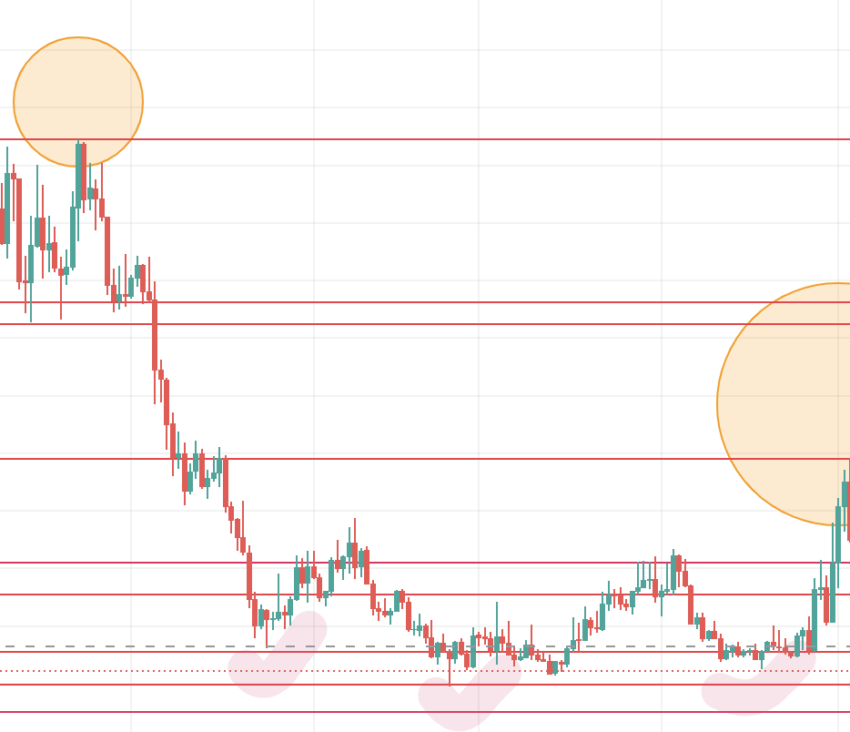 Para isso, vamos dar uma olhada nas mudanças de preço desde o último fundo. Além disso, vamos ignorar as duas primeiras máximas, pois aconteceram no final do ciclo de alta.