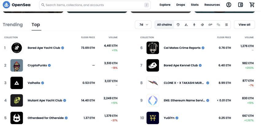 Aqui está uma estatística do OpenSea com as principais coleções de NFT por volumes dos últimos sete dias. Observe que o Ethereum Name Service ocupa o nono lugar na lista. Além disso, na lista de 30 dias, ocupa o sétimo lugar.