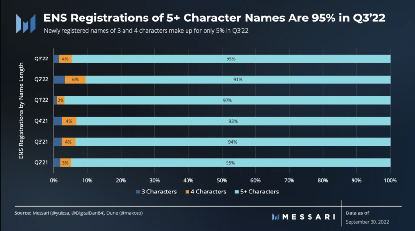 As pessoas percebem os domínios ENS como ativos digitais, o que mostra um aumento de registros e renovações. Os registros de domínio com mais de 5 caracteres – que são mais baratos do que nomes de três e 4 caracteres – aumentaram 95% no trimestre. Isso significa que as pessoas estão procurando opções mais baratas e tentando ganhar exposição a esse projeto de qualquer maneira.