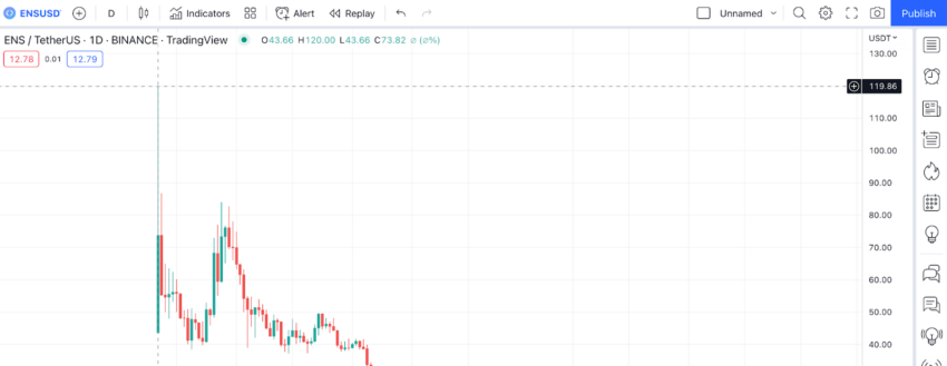 Os tokens ENS foram oferecidos a partir de 11 de novembro de 2021. O preço de abertura foi de quase US$ 120. Naquele dia, fechou com o preço mais alto de todos os tempos, US$ 85,69. Desde então, não tocou naquele ponto alto novamente.