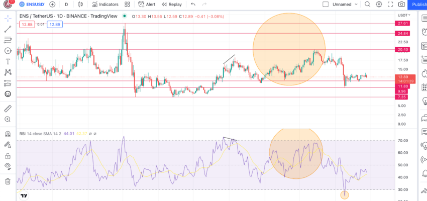 - Os preços dos tokens ENS respondem bem às divergências. Aqui está uma divergência de baixa onde o RSI estava fazendo máximos mais baixos e o preço estava fazendo máximos mais altos. Logo depois veio uma correção de preço.