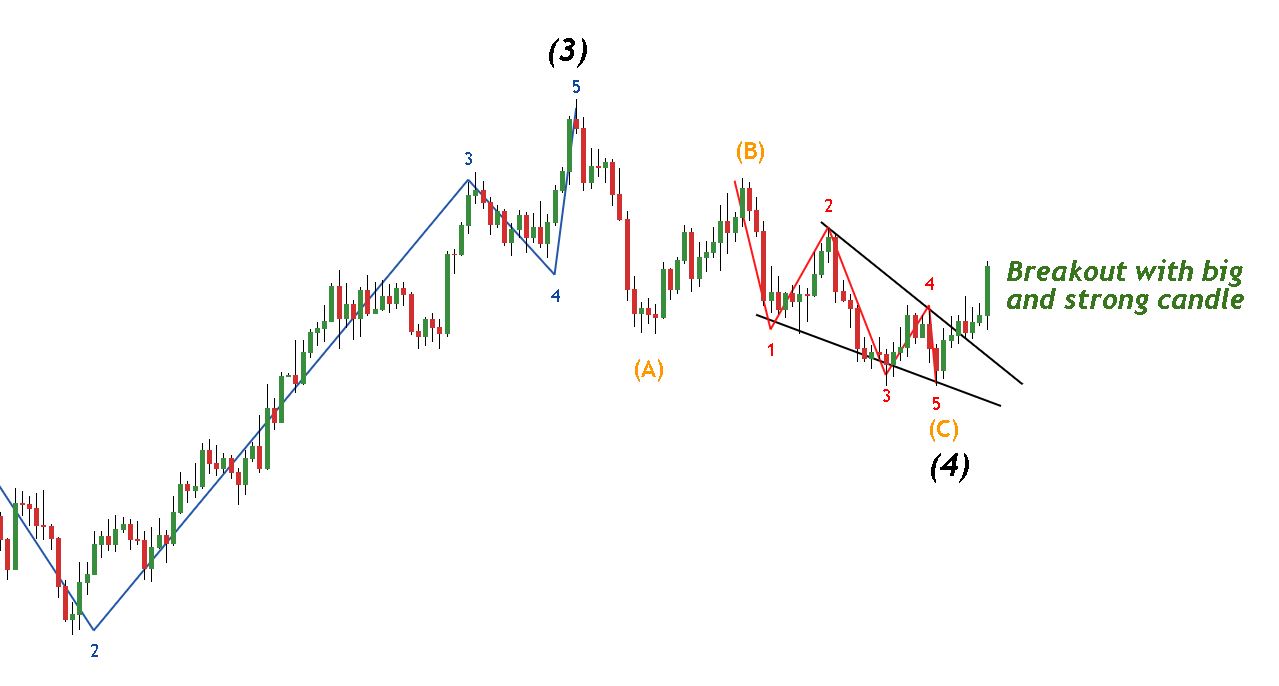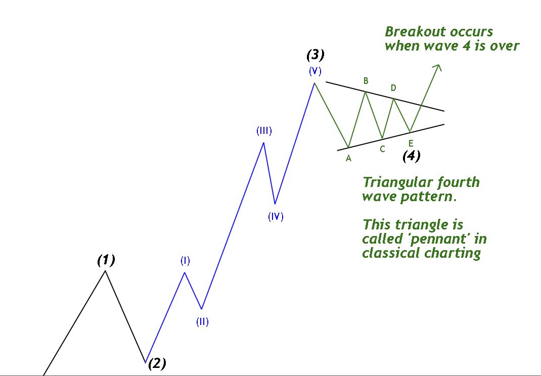 Essa peculiaridade é exclusiva das quarta ondas e é dividida em um ‘padrão de 5 ondas’ (nomeado pelas letras A-B-C-D-E). Da mesma forma, a quebra de um triângulo significa o final da quarta onda e o início da quinta onda. Comparado com o ‘padrão diagonal final’, esse novo triângulo A-B-C-D-E ocorre com mais frequência.