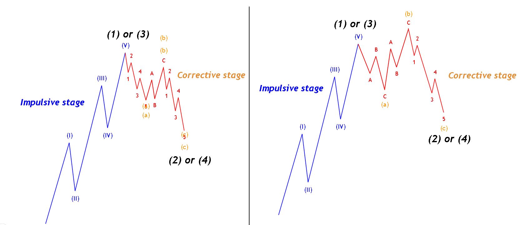 - O estágio impulsivo consiste em 5 ondas nomeadas por números e o estágio corretivo em 3 ondas nomeadas por letras.