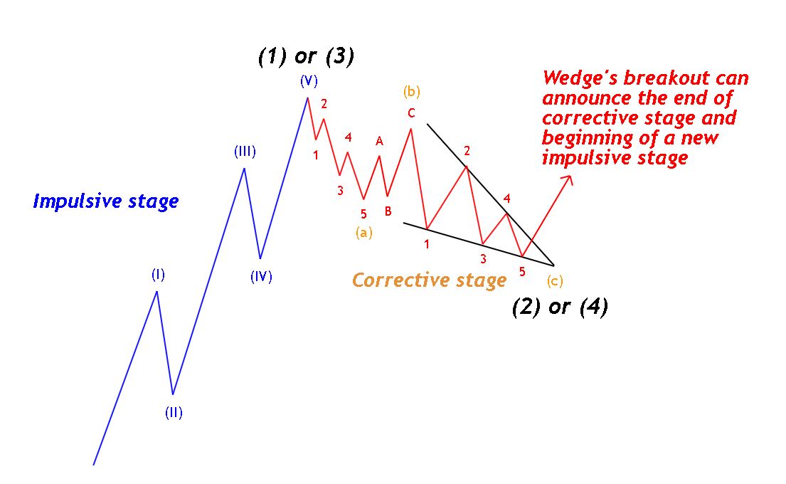 - Os rompimentos em triângulo podem anunciar o fim do estágio corretivo e o início do próximo impulso (onda 3 ou 5).