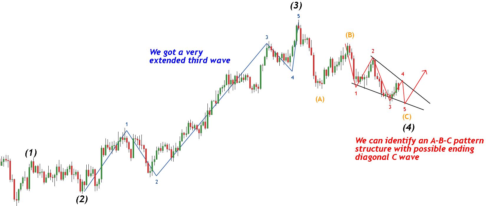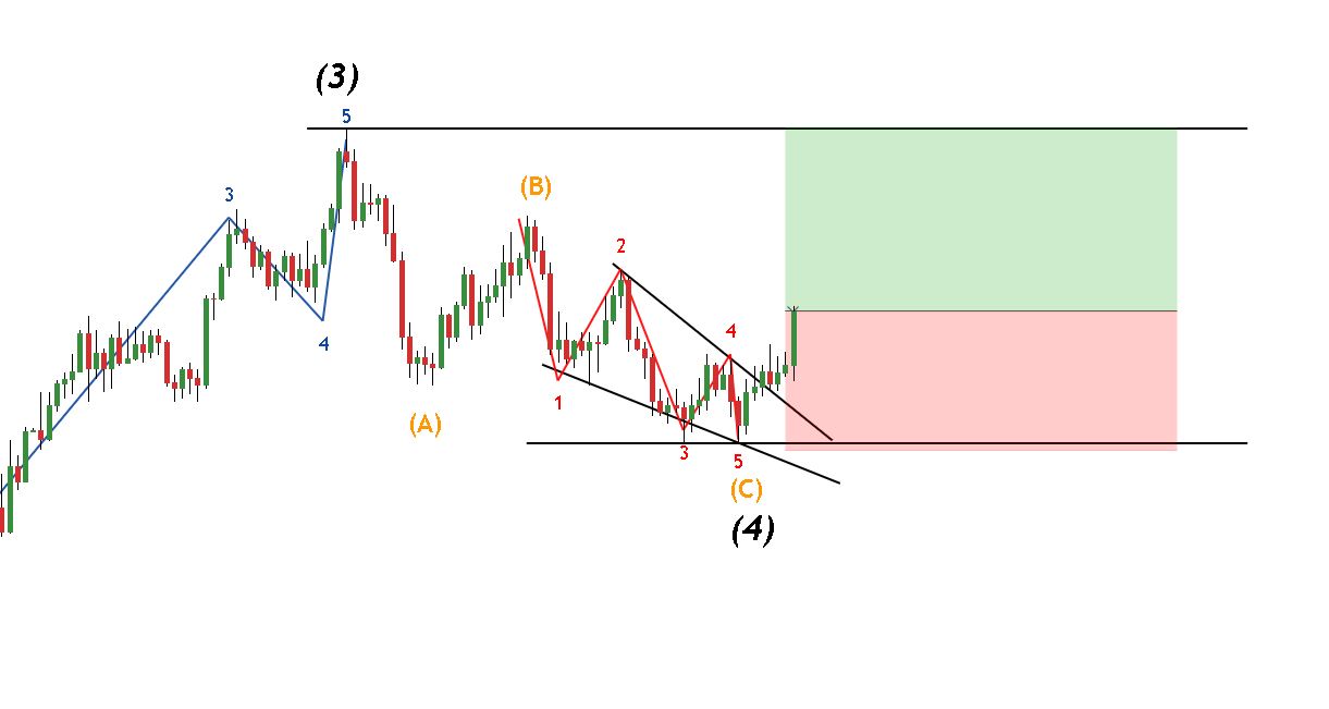 2. O exemplo atual mostra uma tendência de alta, faremos uma negociação comprada (long) . Agora, precisamos aguardar um estágio corretivo claro para identificar A-B-C com estrutura diagonal final ou A-B-C-D-E com uma estrutura triangular corretiva completa.