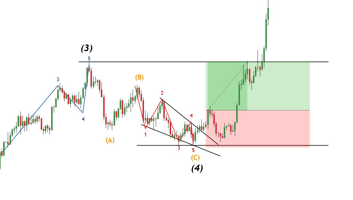 4. Chegou a hora de entrar comprado no trade. Entraremos com uma posição de compra, o stop loss estará abaixo da mínimo da quarta onda e o alvo no ponto máximo da terceira onda.