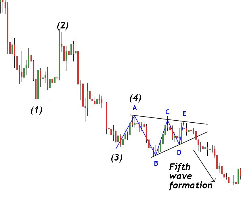 - Todos os padrões explicados aqui funcionam em um cenário de baixa. Vamos ver um padrão de baixa da quarta onda A-B-D-C-E com um gráfico real: