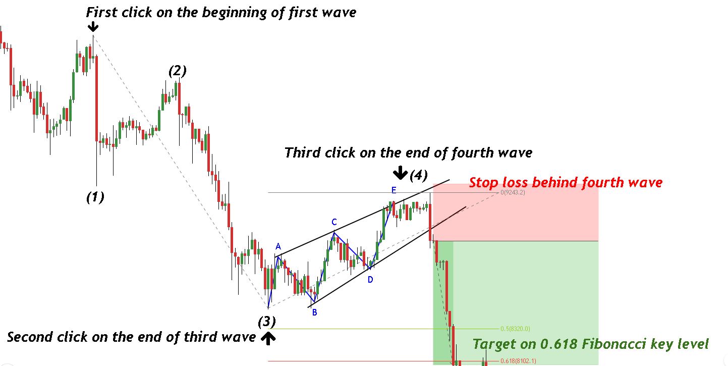- Todos os padrões explicados aqui funcionam em um cenário de baixa. Vamos ver um padrão de baixa da quarta onda A-B-D-C-E com um gráfico real: