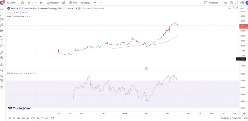 O EFUT da VanEck era negociado a US$ 30 em 15 de março de 2024, de acordo com este gráfico.