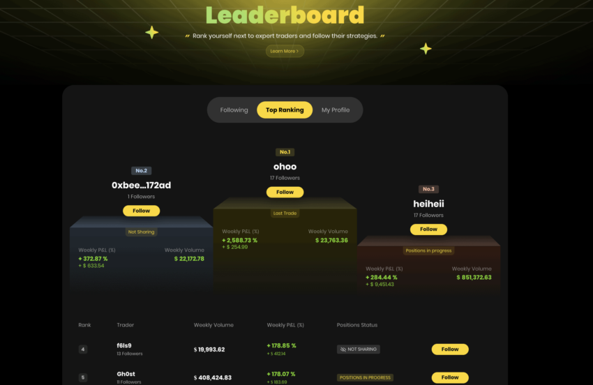 Mesmo que a exchange ApeX não mencione explicitamente o copy trading, você pode ver as principais contas verificando a “Tabela de classificação”. Este segmento também lista os indivíduos que você segue, permitindo rastrear suas carteiras de negociação.