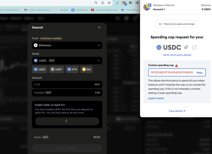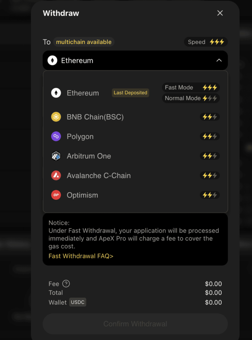 Quanto aos depósitos e saques, as carteiras padrão para solicitar depósitos em livros e vice-versa são executadas sem a cobrança de taxa pela exchange ApeX. No entanto, uma taxa mínima de cinco USDC deve ser paga para saques mais rápidos, independentemente do valor da transação. A taxa máxima para transações mais rápidas pode chegar a 0,1%.