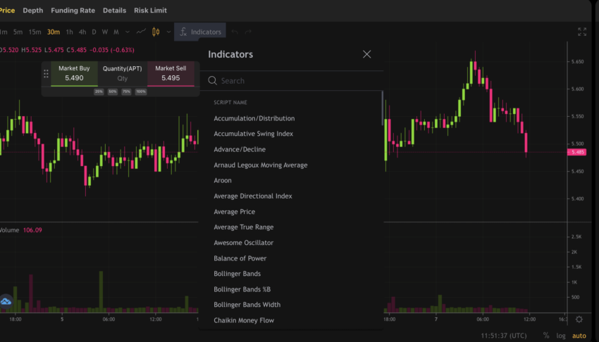 Graças à excelente cobertura, você pode usar a ApeX Pro como um aplicativo móvel ou para PC. Uma vez feito isso, você só precisa ir até a seção “Negociação”, conectar sua carteira, ativar as permissões e começar a usar o aplicativo. A interface de negociação é carregada com todos os indicadores possíveis que você normalmente obtém no TradingView, permitindo localizar os melhores preços para entrar ou sair.