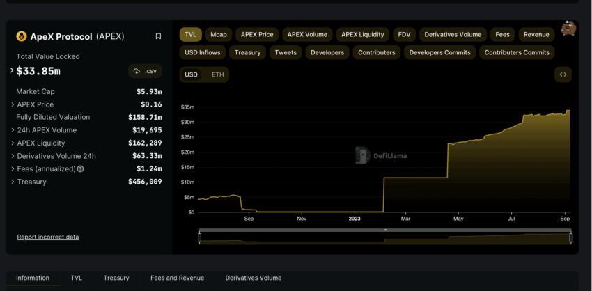 Construído no Arbitrum, uma das soluções populares de camada 2 do Ethereum, a ApeX é uma DEX com cerca de US$ 34 milhões bloqueados em TVL. Com a StarkWare cuidando da segurança comercial, cortesia da ZK-Proofs, e os principais investidores globais, como Tiger Global e Dragon Fly Capital, apoiando a plataforma, a ApeX está fazendo avanços gigantescos no espaço de derivativos descentralizados.