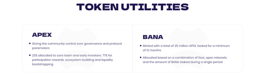 O protocolo ApeX é alimentado por dois tokens nativos – APEX, o token de governança, e BANA, o token de recompensas. Esses tokens oferecem casos de uso totalmente novos para esta plataforma, com detentores de tokens APEX capazes de governar, votar e participar de staking. O BANA é o token utilitário do ecossistema ApeX, acumulado como recompensas ou como airdrops.
