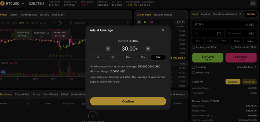 Mas não é apenas a funcionalidade de margem cruzada que se destaca. A ApeX Pro também oferece alavancagem entre 20x e até 30x para negociações específicas. Os traders podem usar garantias e alavancar até 20x (até 30x em alguns casos) para maximizar as chances de obter lucros.