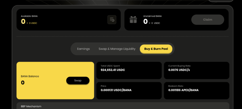 Os tokens BANA são creditados semanalmente, e podem ser trocados por USDC, usados para adicionar liquidez ao pool BANA-USDC específico da DEX, ou trocados por tokens APEX se mantidos por um ano inteiro.