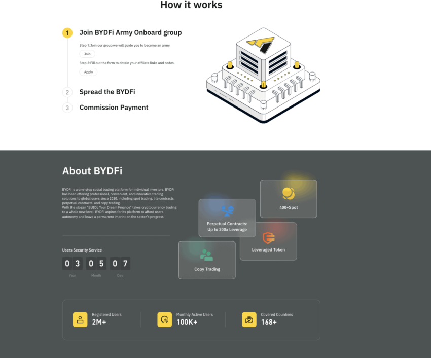 - O programa de parceria “Exército BYDFi” para auxiliar na promoção da exchange.