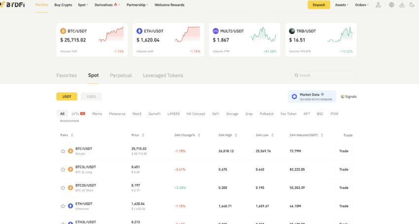 Outro aspecto da perfeição da BYDFi é a interface de usuário amigável. Ao ir para a seção “Mercados”, você primeiro percebe como spot, derivativos e tokens alavancados são listados com base em seus máximos, mínimos, volume e uma opção de um toque para “Negociar”.